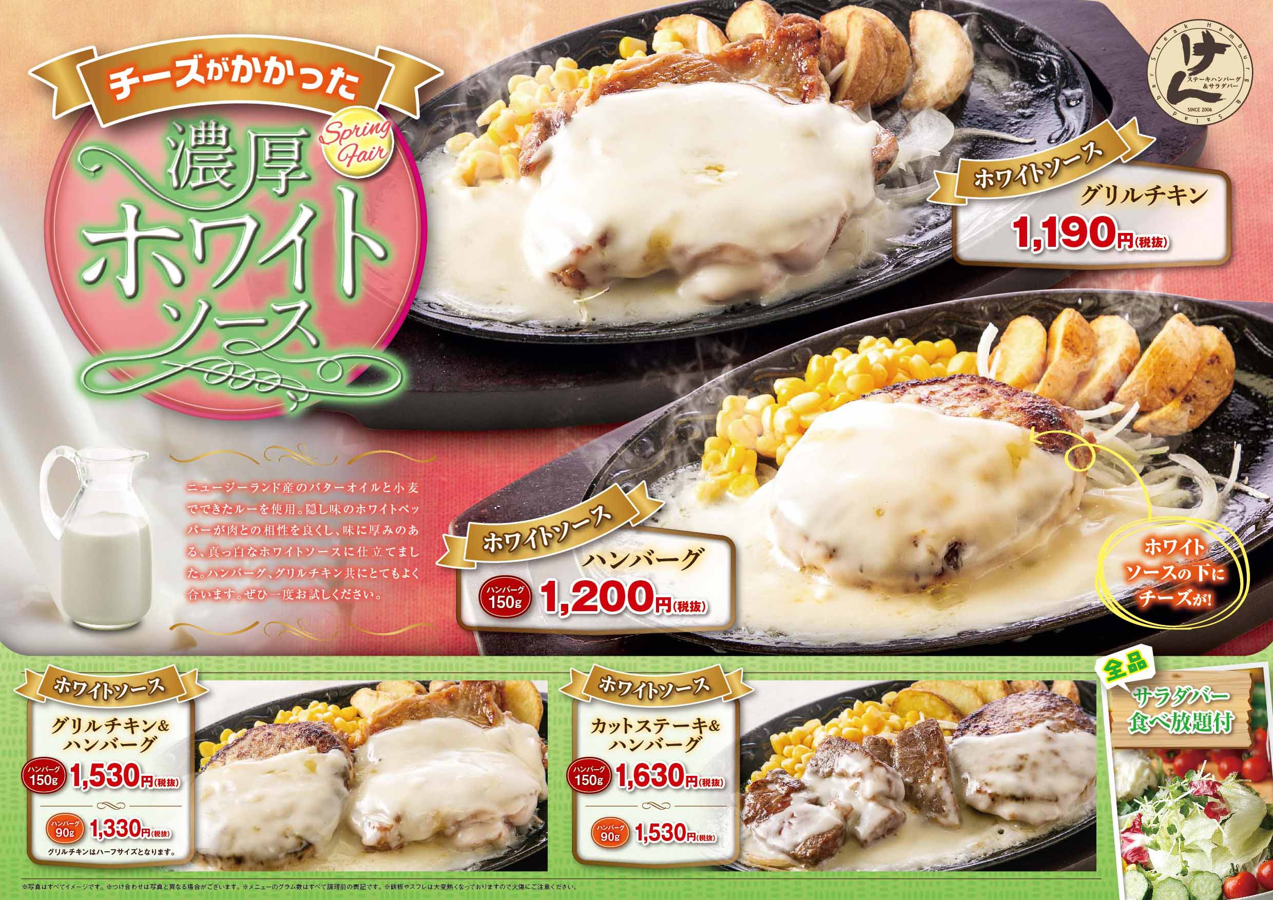 真っ白なホワイトソースに仕立てました。ハンバーグ、グリルチキン共に