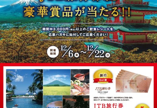 開催期間内に3000円(税込)以上のお飲食レシートを、 応募ハガキに貼付してご応募しますと抽選で40組様に豪華賞品が当たります!! 〇JTB旅行券50,000円分⇒5組様 〇贅沢お食事券50,000円分⇒5組様 〇お手...