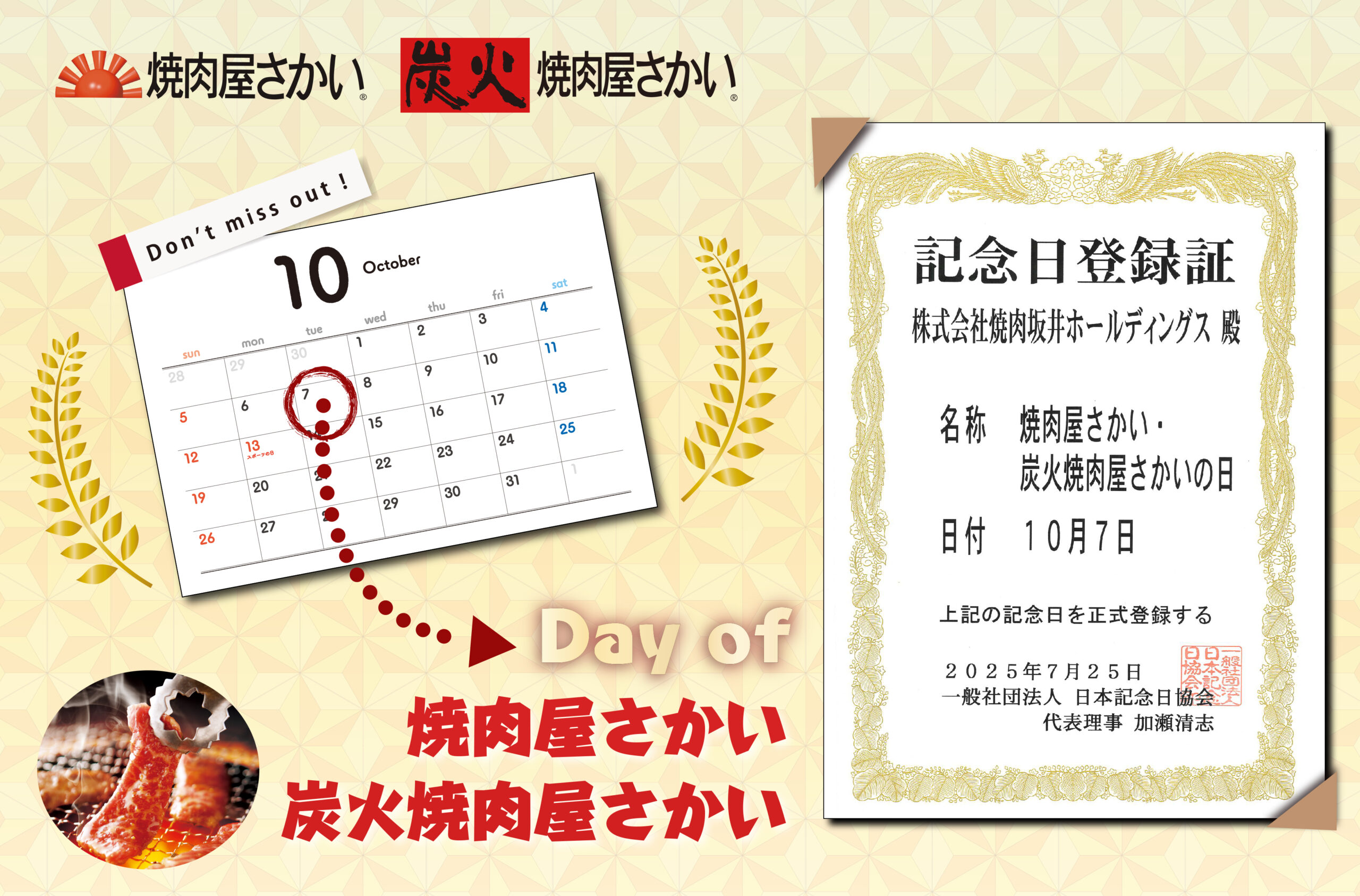 10月7日「焼肉屋さかい・炭火焼肉屋さかいの日」が日本記念日協会に正式登録されました