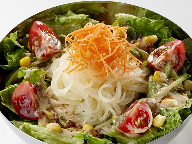 かぼちゃ、ブロッコリーなど、ごろごろ野菜の入った香り立つスパイスのスープカレーです。具材のごぼうは北海道帯広産の和田農園の主力野菜である「ごぼう」です。「わだのごぼう」で商標登録もされています。 ◎有限会社 和田農園 のホームページはコチラをクリックしてください。 レーメンサラダ 690円(税込759円)