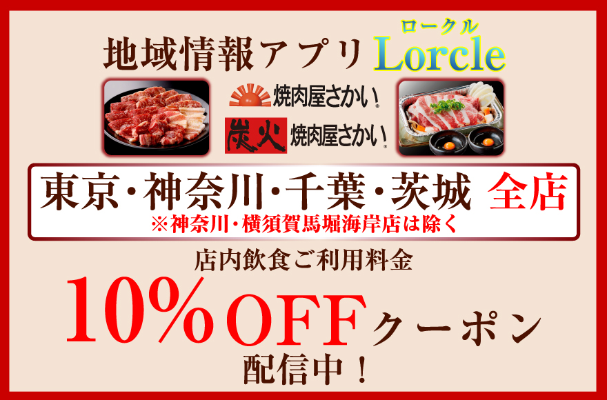 地域情報アプリ「Lorcle(ロークル)」にて 焼肉屋さかい / 炭火焼肉屋さかい 東京都・神奈川県(除く横須賀馬堀海岸店)・千葉県・茨城県 内全店でご利用できます「店内飲食ご利用料金 10%OFFクーポン」配信中です。